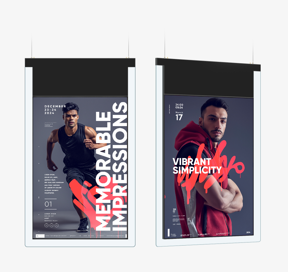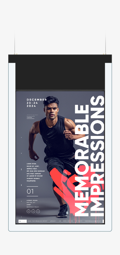The timeless, minimalist design harmonizes perfectly with any business environment, while the high-resolution visuals and bold colors bring your campaigns to life. The combination of expressive images, dynamic typography and clear messages ensures a professional and appealing presentation. Ideal for gyms, lifestyle products, events or retail, these displays offer the perfect stage for your content.