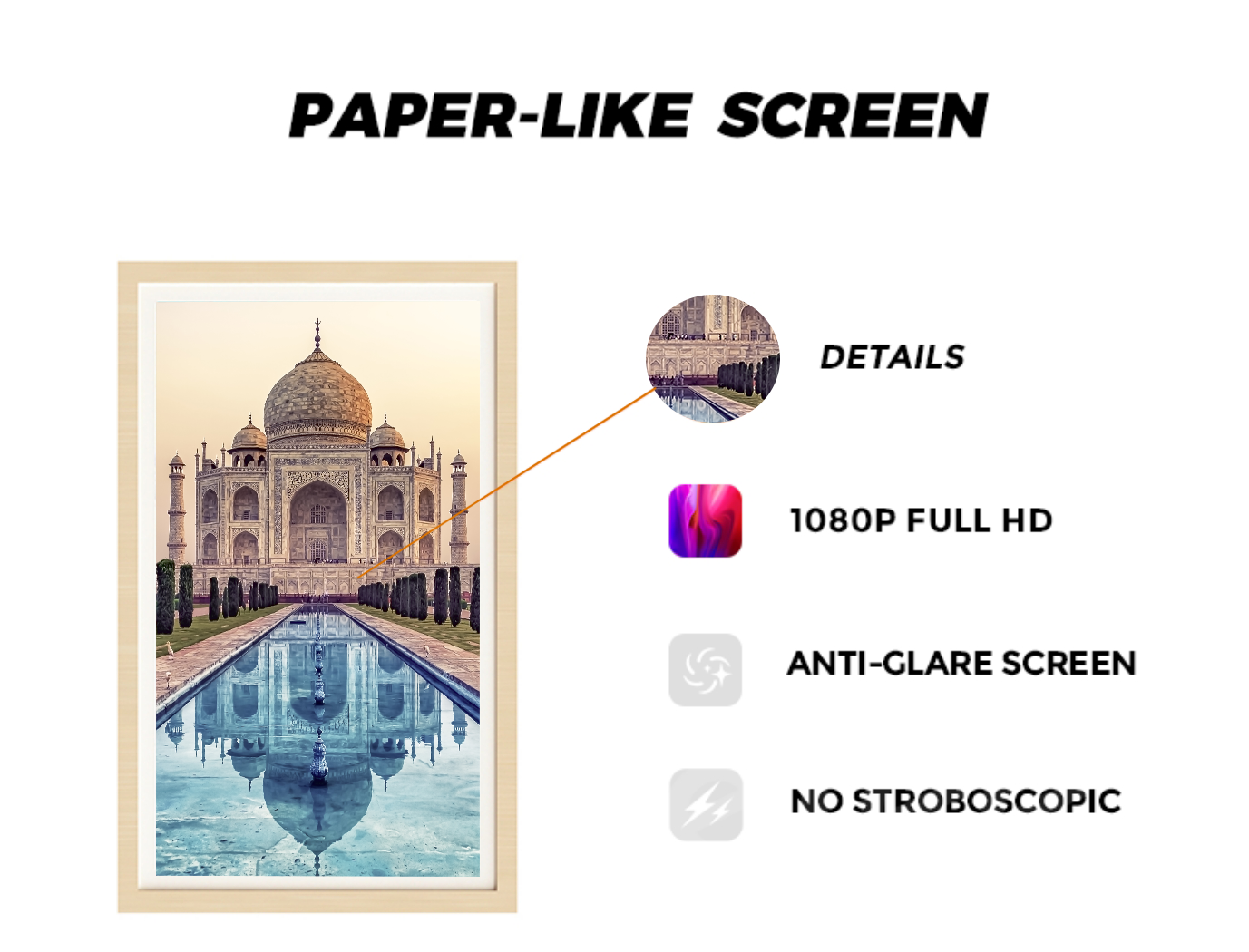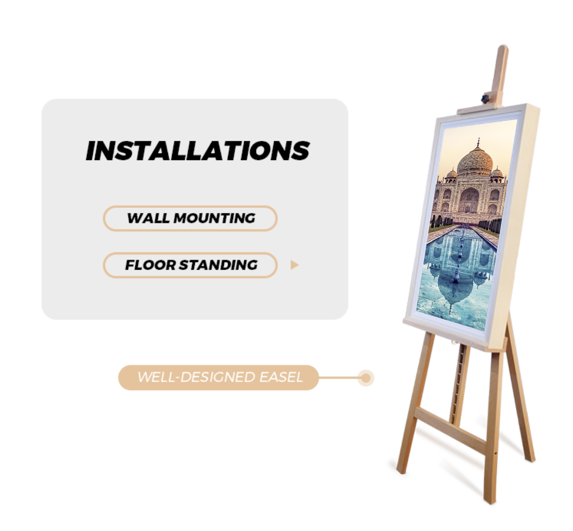 Das schlanke Design fügt sich harmonisch in jede Umgebung ein – ob in Galerien, Museen, modernen Wohnräumen oder Büros. Dank einer speziellen Antireflex-Beschichtung wirkt das Display wie eine echte Leinwand.